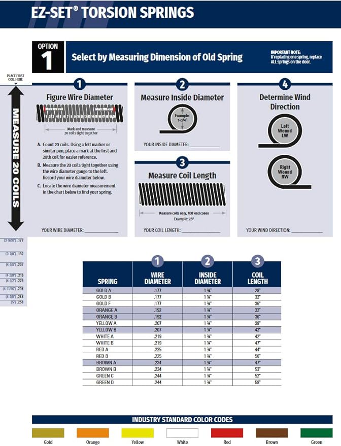 When the door is closed and at rest the torsion spring stores enormous amounts of energy and when you want the door to open the spring helps by uncoiling and releasing that energy. As with the vertical lift doors, the formula for the number of turns on the springs is complex. Measure the outside diameter, and then subtract twice the wire diameter. Then use this common garage door torsion spring length chart! Of course, there will be times when you have a measurement that does not appear on the chart, but these are the most common measurements based on wire size, inside diameter and spring. For a double door use two bath scales, a foot in from each side of the opening. In most (not all) cases, the end on the right hand wind is black and the. Garage door torsion spring winding chart notes. Here are some quick notes about winding your garage door springs: Tools for doing this for 1 3/4, 2, and 2 1/4 id springs are on our standard garage door torsion springs page. You can keep track of the number of turns by drawing a chalk line on the springs. For all other information and safety warnings concerning your garage door, see the manual. What a lot greater can be shown regarding this fascinating garage door torsion spring winding chart when your eyes can indulge themselves via owning a browse this great picture proven listed underneath?